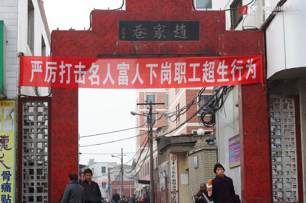 2009年3月22日,湖北襄樊,一街巷口悬挂的“严厉打击名人富人下岗职工超生行为”标语。