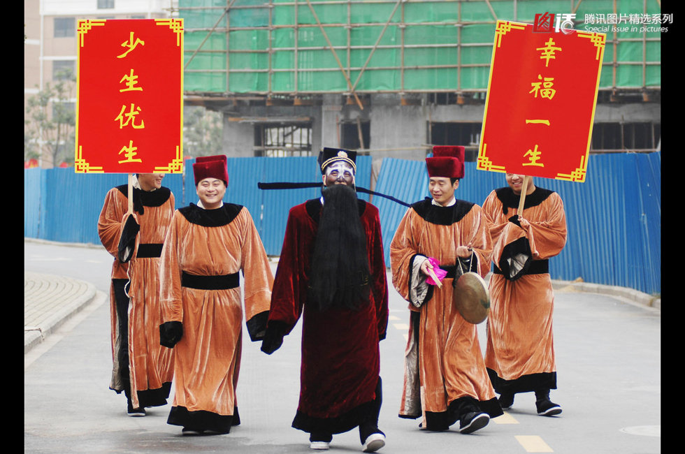 2010年2月4日,合肥市五里墩街道一年一度的“计生迎春”活动在陈村社区举行。工作人员扮演包拯、王朝、马汉、张龙、赵虎,举着计生标语牌在社区宣传。